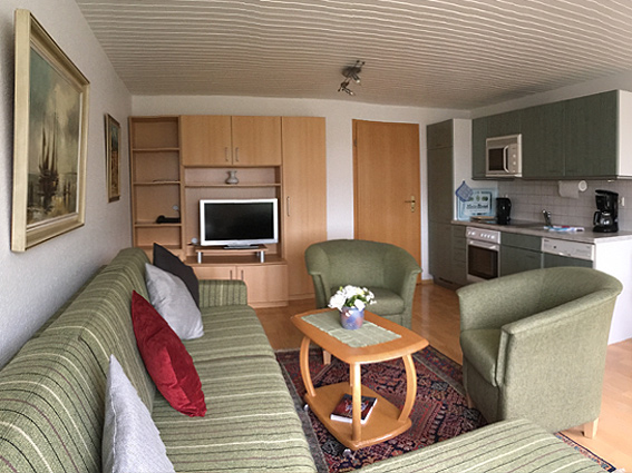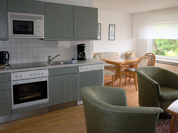mit Fernseher und Telefon. Küchenzeile mit Spülmaschine, Mikrowelle